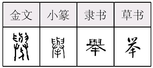 举jǔ〖副词〗 表示主语所指的人或事物都具有某一动作行为或性状。可译为“都”、“全”、“全部”等(7)。《曾子易箦》:举扶而易之,反席未安而没。——几个人都扶他起来,换掉席子,回到床席上还没睡好,就死去了。《贾谊治安策一》:须其子孙生者,举使君之。——等待他们的子孙生下来,全部让他们为君王。《钴鉧潭西小丘记》:由其中以望,则山之高,云之浮,溪之流,鸟兽之遨游,举熙熙然回巧献技,以效兹丘之下。——从小丘中间眺望,山峰高峻,云彩飘浮,小溪流动,鸟兽遨游,它们都和乐地运用巧慧,献出长技,在这个小丘下表演。 举舉,擧jǔ❶ 往上托,抬起。《齐桓晋文之事》:“吾力足以~千钧,而不足以~一羽。”李白《静夜思》:“~头望明月,低头思故乡。” ❷ 选拔,举荐。诸葛亮《出师表》:“是以众议~宠为督。”韩愈《柳子厚墓志铭》:“斥时,力能~之,且必复用不穷。” ❸ 科举考试,赴试或考中都叫“举”。李朝威《柳毅传》:“有儒生柳毅者,应~下第。”《明史·海瑞传》:“海瑞字汝贤,琼山人,~乡试。” ❹ 提出。《论语·述而》:“~一隅不以三隅反,则不复也。” ❺ 发动,推行。《陈涉世家》:“今亡亦死,~大计亦死。”王安石《答司马谏议书》:“~先王之政,以兴利除弊,不为生事。” ❻ 攻克,攻占。李斯《谏逐客书》:“~地千里,至今治强。”杜牧《阿房宫赋》:“戍卒叫,函谷~。” ❼ 生育,抚养。《史记·孟尝君列传》:“文以五月五日生,婴告其母曰:‘勿~也。’其母窃~生之。” ❽ 检举,揭发。《史记·秦始皇本纪》:“吏见知不~者,与同罪。” ❾ 全,尽。《庄暴见孟子》:“~欣欣然有喜色而相告。”《鸿门宴》:“杀人如恐不能~,刑人如恐不能胜。” 举*△舉;擧juBED9 ❶手往上托:~杯/~手/~重/抓~/~案齐眉。 ❷举动;行为:~措/~止/创~/壮~/义~/一~一动。 ❸发起,兴起:~办/~行/~事/~兵/~义。 ❹推选:~荐/保~/推~/选~/公~。 ❺提出:老师~了几个例子给我们看/检~/列~/不胜枚~。 ❻全:~世瞩目/~国同庆/~座皆惊。 ❼古代科举考试,也指考中的人:中~/武~/赴~。 ❽〈文〉生育:中年~儿子,漫种老生涯(黄庭坚诗)。 列举 列举胪(胪列;胪举) 举(揭举) 骈陈列 罗列 开设 标位 举出罪恶:进恶 列举其罪而正之以法:举正 指点列举:指列 称说列举:称举 依类列举:类列 分项列举:款列 参互列举:错举 同时列举:并举 骈比罗列:骈罗 逐条列举:条举 疏举 一一列举:枚列 枚数 枚举 件举 缕举 全部列举:遍举 悉数(~难尽) 详细列举:备举 备列 粗略或琐细地列举:毛举 大略列举:概举 列举其大要:举凡 琐碎地列举细小的事情:毛举细故 毛举细事 毛举细务 琐碎地列举无用或没有价值的东西:毛举糠秕 琐碎地列举各种政务或琐事:毛举庶务 不值得或没有必要一一列举:不足悉数 (一个一个地举出来:列举) ☚ 举例 表示列举 ☛