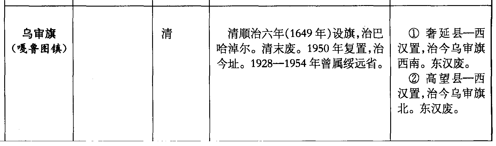 乌审旗(嘎鲁图镇)清清顺治六年(1649年)设旗,治巴哈淖尔。清末废。1950年复置,治今址。1928—1954年曾属绥远省。❶ 奢延县—西汉置,治今乌审旗西南。东汉废。❷ 高望县—西汉置,治今乌审旗北。东汉废。