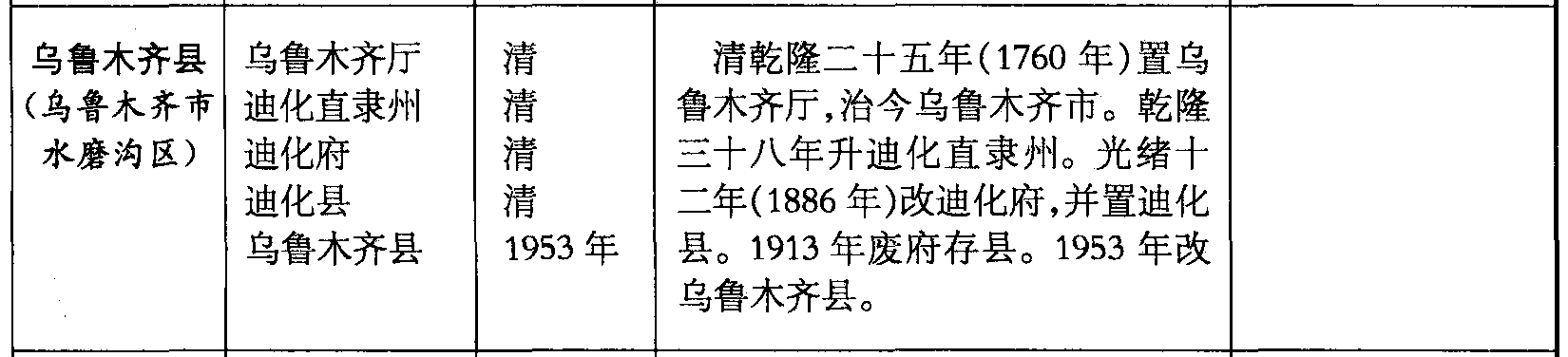 乌鲁木齐县(乌鲁木齐市水磨沟区)乌鲁木齐厅迪化直隶州迪化府迪化县乌鲁木齐县清清清清1953年清乾隆二十五年(1760年)置乌鲁木齐厅,治今乌鲁木齐市。乾隆三十八年升迪化直隶州。光绪十二年(1886年)改迪化府,并置迪化县。1913年废府存县。1953年改乌鲁木齐县。