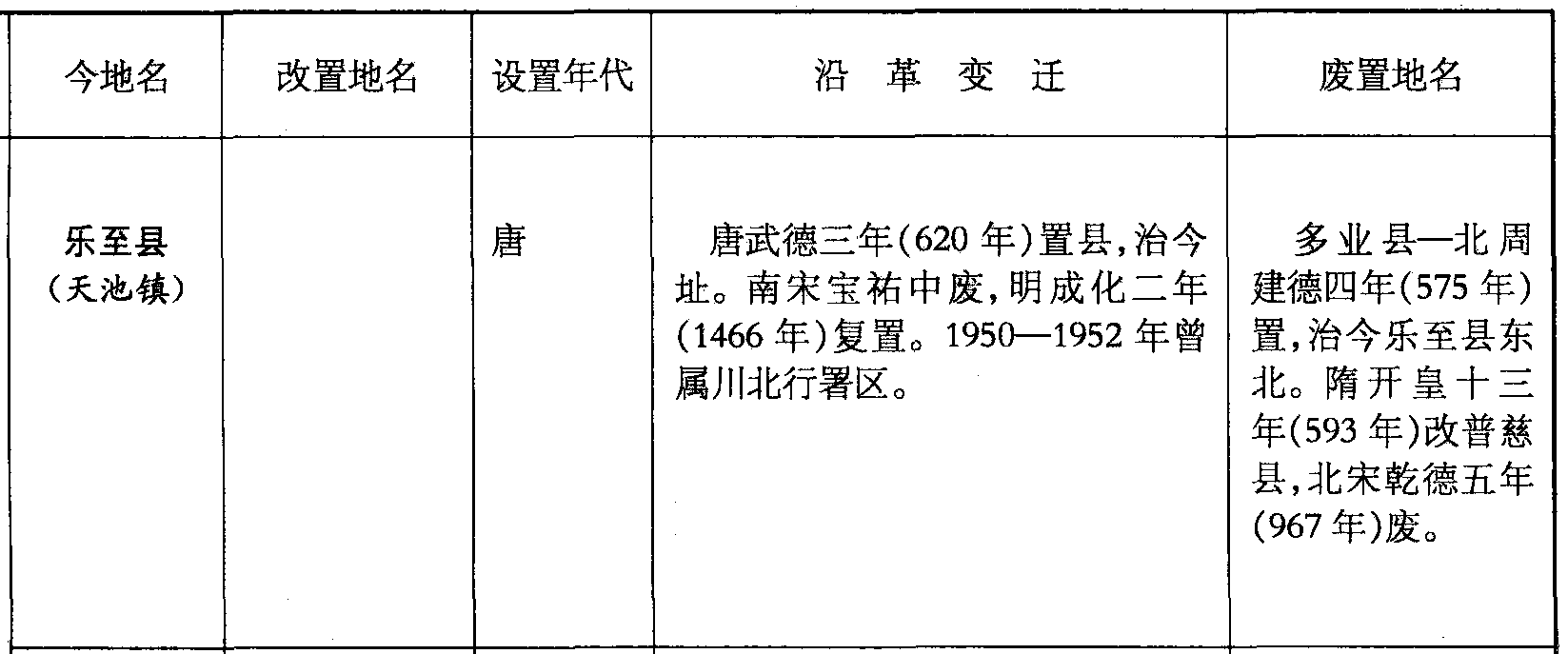 乐至县(天池镇)唐唐武德三年(620年)置县,治今址。南宋宝祐中废,明成化二年(1466年)复置。1950—1952年曾属川北行署区。多业县—北周建德四年(575年)置,治今乐至县东北。隋开皇十三年(593年)改普慈县,北宋乾德五年(967年)废。