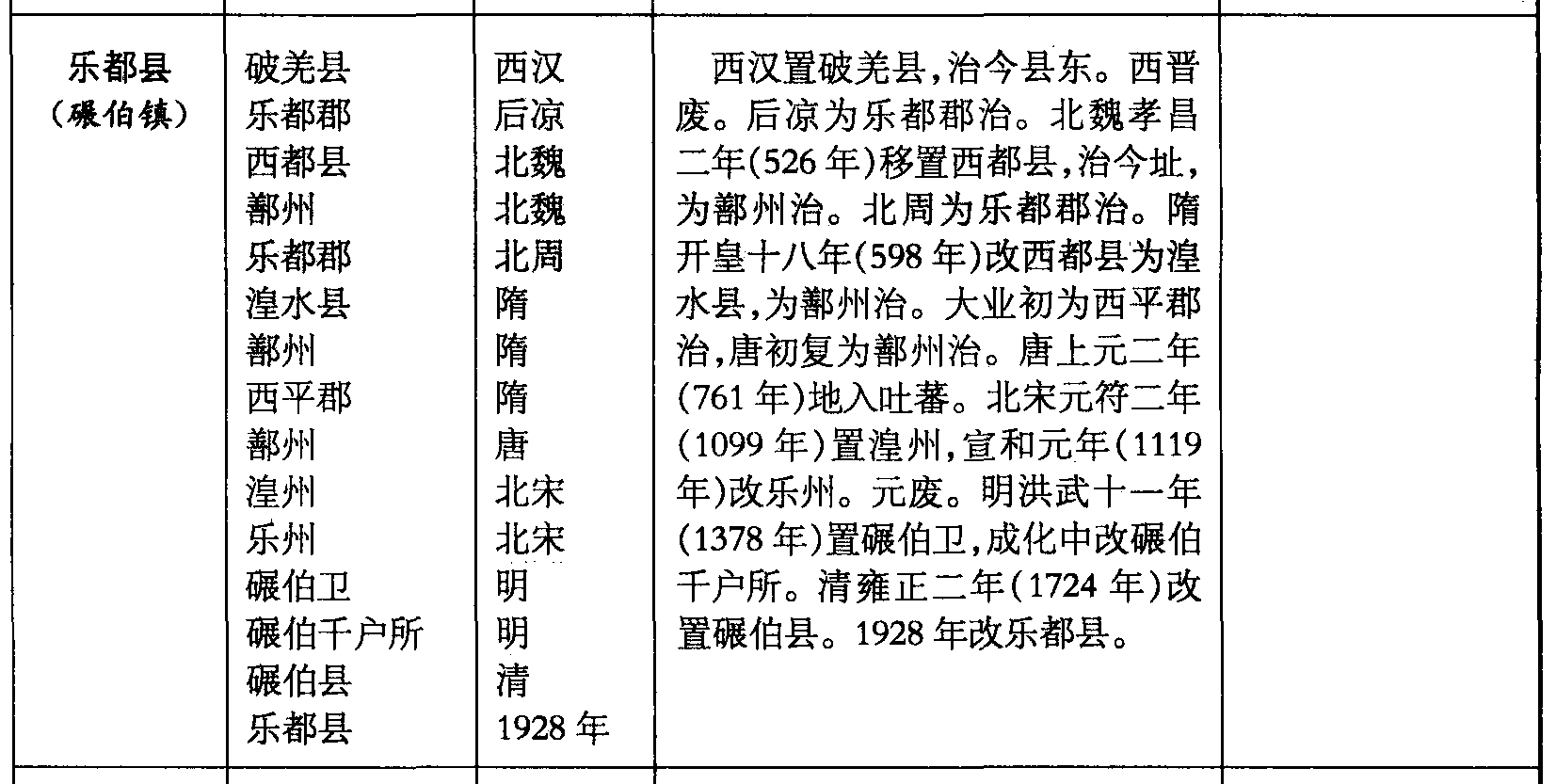 西汉置破羌县,治今县东。西晋废。后凉为乐都郡治。北魏孝昌二年(526年)移置西都县,治今址,为鄯州治。北周为乐都郡治。隋开皇十八年(598年)改西都县为湟水县,为鄯州治。大业初为西平郡治,唐初复为鄯州治。唐上元二年(761年)地入吐蕃。北宋元符二年(1099年)置湟州,宣和元年(1119年)改乐州。元废。明洪武十一年(1378年)置碾伯卫,成化中改碾伯千户所。清雍正二年(1724年)改置碾伯县。1928年改乐都县。