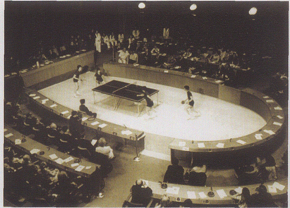 乒乓外交 乒乓外交1971年3月,中国乒乓球代表团在日本参加第31届世界乒乓球锦标赛时,中美运动员间进行了友好接触,后来中国邀请美国乒乓球队来访。打开了中断20年之久的中美两国关系大门,成为两国邦交正常化的先行。这一具有历史意义的事件,在国际上引起很大反响,被称之为“兵乓外交”。翌年,中国兵乓球队接受邀请,回访了美国。 ☚ 冠军的冠军 世界第一运动 ☛ 乒乓外交 乒乓外交pīngpāng wàijiāo通过乒乓球的友谊比赛,促进我国与世界各国人民的友谊和交往。特指1971年4月10日至17日,参加在日本名古屋举行的第31届世界乒乓球锦标赛的美国乒乓球代表团应中国乒乓球代表团的邀请访问我国,打开了隔绝22年的中美交往的大门,被国际舆论誉为“乒乓外交”。 ☚ 聘任制 平板电视 ☛ 乒乓外交 088 乒乓外交1971年4月6日,中国邀请在日本名古屋参加第31届世界乒乓球锦标赛的美国乒乓球队访问中国,4月10至16日,美国乒乓球队在北京访问。周恩来总理于4月14日接见美国乒乓球队时说:“你们这次应邀来中国访问,打开了两国人民友好往来的大门。”它开创了中美两国民间交往的政策。故有“乒乓外交” 之称。 ☚ 中国同非洲和阿拉伯国家关系的五项原 三个世界划分的理论 ☛ 乒乓外交 乒乓外交美国总统尼克松上台后,调整美国对外战略,表示愿意改善美国同中华人民共和国的关系,中国对此作出积极反应。1971年4月6日,中国邀请在日本名古屋参加第三十一届世界乒乓球锦标赛的美国乒乓球队访问中国,这是中国为恢复中美接触而采取的一个重大步骤,它以民间往来的形式推动了整个中美关系正常化的进程。 ☚ 全人类利益 多极世界 ☛ 乒乓外交ping-pong diplomacy 乒乓外交ping-pong diplomacy (1971年在日本名古屋举行的世界乒乓球赛接近尾声时,中国乒乓球队邀请美国队来华访问,从而打开了中美两国交往的渠道) |