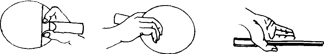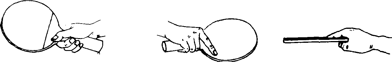 横拍握法动作要领 ❶以中指、无名指、小指自然地握住拍柄,拇指在球拍的正面轻贴在中指旁。 ❷食指自然伸直斜放于球拍的背面,虎口轻微贴拍。此种握法称作浅握。若虎口紧贴球拍,则称作深握。