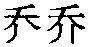【提示】起笔是撇,不是横;下面是一竖撇、一竖,不要写成两竖。 *乔(喬)qiáo6画 丿部 (1) 高: ~木。 (2) 装假;做作: ~装。 乔喬qiáo春秋时金文从中从高,中在高屋顶上,是高义。战国时从力或从止,从高。都是登高义,在高处义。会意字。小篆从高省从夭,夭亦声。夭字是人形,也是登高义。夭与乔音变略如尧跷翘例;声母喉音与舌根音相通,并且叠韵。组词如:乔木(高大树木,如松柏等)|乔迁(称人搬家的客气话)。元代以来简化作乔,易学易写。现作规范字,见《总表》。转义为作假,装。组词如:乔装(也作乔妆。指改变服装面貌,掩蔽身份)。 乔喬★繁◎常★常