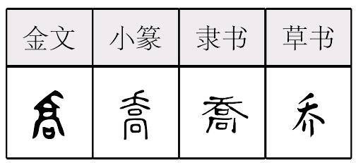 ❹ 出谷迁乔|寿同松乔 乔qiáo繁体为“喬”,由“夭”与“高”(省)构成。“夭”表声,“高”表意,属形声字。本义为“高”。《诗·郑风·汉广》:“南有乔木,不可休思。”“乔迁”,往高处迁,即用其本义。作声符生成的字有: qiáo 侨(侨民,乔迁之民,乔表音兼表意) 桥(桥梁。乔兼表意) 荞(荞麦) jiao 阴平:骄(骄傲。骄,本指六尺高马,引申为高) 娇(娇贵) 阳平:矫(矫情) 上声:矫(矫正) 去声:轿(轿车) 峤(山道) 乔喬qiáo(6画)