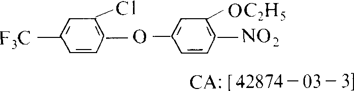 性能 原药有效成分含量为70~80%,黄色至红褐色,半固体,密度 1.49(25℃),沸点250~300℃,70%的原药熔点为59~78℃,80%的原药熔点为68~83℃,闪点大于93.33℃(闭式),25℃时蒸气压为0.27×10-3帕,在常温下几乎不溶于水(25℃时在水中的溶解度小于1毫克/升),在丙酮、乙醇、二甲苯中的溶解度大于50%,在异丙叉丙酮、二氯乙烯中溶解度大于40%,容易光解。乙氧氟草醚属低毒,原药大鼠急性经口LD50大于5000毫克/千克,兔急性经皮LD50大于10000毫克/千克。大鼠急性吸入LC50大于213毫克/升,对皮肤有轻度刺激作用,对眼睛有中度刺激作用,但在短期内即可消失,在试验剂量内对动物未见致畸、致突变、致癌作用。在三代繁殖试验和迟发性神经毒性试验中未见异常。对鱼类及某些水生生物高毒,96小时蓝鳃鱼LC50为0.2毫克/升,虹鳟鱼LC50为0.26毫克/升,鲇鱼LC50为0.4毫克/升,河蚶为3.20毫克/升。对蜜蜂毒性较低,急性经口LD50为25.381微克/只。对鸟类低毒,鹌鹑LD50大于5000毫克/千克; 野鸭用100毫克/千克喂养未见有毒害作用。 作用机制 芽前或早期芽后处理,主要通过胚芽鞘、中胚轴进入植物体内,根部吸收较少。在植物体内引起植物毒性的确切机制还不十分清楚,已经知道氧化氟分子在线粒体内引起、产生有毒的氧基原子团,不饱和细胞膜类脂物的过氧化反应,引起细胞内含物外渗。在有光的情况下,发挥杀草作用。在水稻移栽田施用,均系利用稻苗与杂草在生育期的差异,稻苗5叶、20厘米高,而杂草初萌发,移栽稻苗后4~ 6天施药时稗草0.5~ 1.5叶期,其他杂草尚未出土,一般对水稻安全,但在药液与稻株表面接触时,产生褐斑或脚叶早枯,这一症状并不影响稻苗生长发育,很快恢复正常。在水田施用后,由于水溶性极低,移动性较小,吸附于0~ 3厘米表土层中,不易垂直向下移动。被土壤微生物分解成二氧化碳,在土壤中半衰期30天左右。 应用 适用于水稻、甘蔗、大豆、花生、棉花、森林苗圃、葡萄、果树、玉米等作物地防除一年生阔叶杂草、莎草科及禾本科杂草。水稻移栽田适用于秧龄30天以上,苗高20厘米以上的一季中稻和双季晚稻移栽后4~6天,稗草芽期至1.5叶期,每公顷用有效成分35~ 54克,药土法均匀撒施,稻田水层3~ 5厘米,保持5~7天。可与苄嘧磺隆、丁草胺等除草剂各减半混用,扩大杀草谱,提高水稻安全性。陆稻、大豆、花生、甘蔗、棉花、针叶苗圃、某些蔬菜等旱地作物掌握在播后苗前,每公顷用有效成分108~180克,杂草萌发出土前施药。葡萄、果树、茶、桑园、幼林抚育,使用低压喷雾器进行喷雾土壤处理。 乙氧氟草醚oxyfluorfen又称果尔。二苯醚类触杀性除草剂。化学名称:2-氯-1-(3-乙氧基-4-硝基苯氧基)-4-(三氟甲基)苯。化学结构式如左。原药黄色至红褐色半固体,密度1.49 (25℃),沸点250~300℃,熔点68~83℃,闪点>93.33℃(闭式),25℃时蒸气压为266.6×10-6Pa。几乎不溶于水,易溶于丙酮、乙醇、二甲苯、二氯乙烯,易光解。在有光的情况下发挥杀草作用。主要通过胚芽鞘、中胚轴进入植物体内,抑制幼芽生长而致死。适于水稻田使用,也可用于大豆、玉米、棉花、蔬菜田及果园。防除稗草、牛毛草、鸭舌草、野荸荠、异型莎草、节节菜、狗尾草、藜、苋、蓼等一年生单、双子叶杂草。对人畜低毒,大鼠急性口服LD50>5000 mg/kg,兔急性经皮LD50>5 000 mg/kg,对皮肤有轻微刺激。对鱼及水生动物高毒,对鸟类低毒。水稻田使用易在叶片上形成枯斑,尤其在施后灌溉水淹及心叶部位,能造成严重药害。