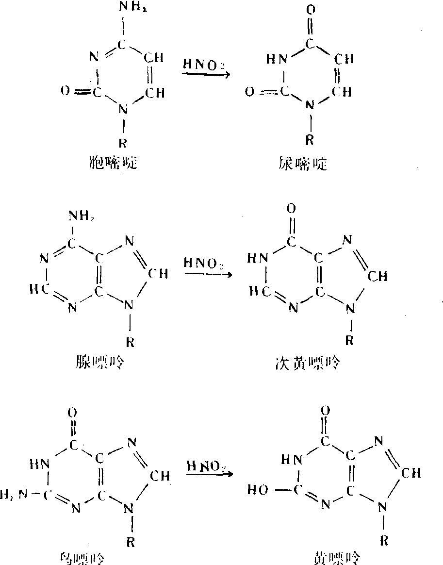 这类化合物是亚硝酸的前体之一,可以转变为亚硝酸。亚硝酸能加速胞嘧啶(C)、腺嘌呤(A)和鸟嘌呤(G)的脱氨基作用。氨基的移去改变了这些碱基生成氢键的性质,因而诱发了基因的突变(图605)。