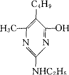| 释义 | 乙菌定ethirimol杂环类杀菌剂。化学名称:5-丁基-2-乙胺基-4-羟基-6-甲基嘧啶。化学结构式如左。原药白色结晶,室温下水中溶解度为0.2 g/L,几乎不溶于丙酮,微溶于乙醇中,在氯仿、强酸和强碱中溶解,对热稳定,酸性溶液对金属有腐蚀作用。1968年由英国卜内门(ICI)公司推广。内吸性杀菌剂。主要以种子处理和叶面喷洒,用于防治禾谷类作物白粉病,种子拌药后可使播种后的若干周内幼苗不受白粉菌感染。对人畜低毒,对大鼠(♀)口服急性LD50为4 000 mg/kg,每天用每ml含50 mg药物的溶液滴入兔眼睛中,只引起轻微刺激,对蜜蜂安全。