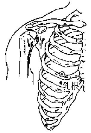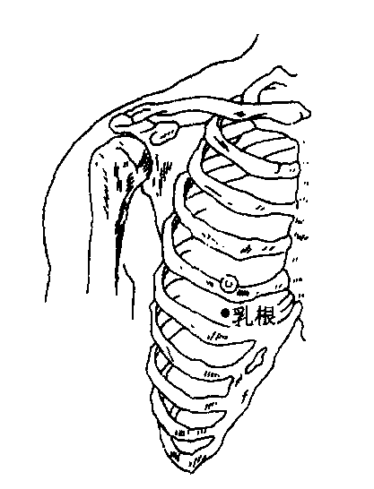 图90 乳根rǔgēn经穴名。代号ST18。出《针灸甲乙经》。别名薜息。属足阳明胃经。位于第五肋间隙, 距胸正中线4 寸处。主治少乳, 乳腺炎, 胸胁痛等。斜刺0. 3 ~0. 5 寸, 禁深刺。灸5 ~ 10分钟。