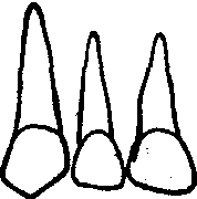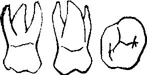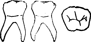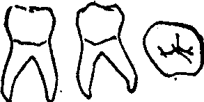 但第二乳磨牙的牙冠较小,颈缘缩小显著,颈嵴较突,牙冠从颈部向颌面内收。 因此, 颌面比牙冠颈部要小得多。上颌第二乳磨牙有三根,下颌第二乳磨牙有两根,但也有三根者(图4、5)。