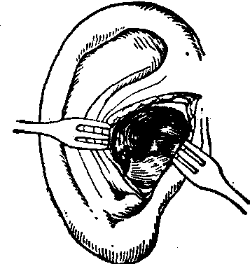 手术步骤: ❶切口: 多作耳内切口,即沿外耳道口后壁软骨与骨部交界处作弧形切开,并向上延切开耳轮脚与耳屏之间。亦可作耳后切口。分离乳突骨膜,暴露外耳道道上三角区标志。 ❷凿开乳突腔、鼓窦及上鼓室并断桥: 自外耳道道上三角区直入凿开乳突骨板至鼓窦,并以鼓窦为中心,扩大鼓窦入口及凿(磨)除鼓窦周围及乳突部病变与气房。在探针指引下逐步凿去上鼓室的外侧骨壁,直抵其前壁,彻底开放鼓窦与上鼓室。分离外耳道后、上壁皮骨膜将骨性外耳道后壁和上壁削薄,并凿断或以咬骨钳咬断骨桥,再尽量削低外耳道后骨壁 (不低于面神经管隆起)。 ❸清理鼓室病变: 细心清除病变粘膜、残缺锤骨和砧骨、肉芽组织、鼓膜张肌和匙突等,必要时可除去残余鼓膜,但不可触动镫骨及前庭窗。亦应刮除咽鼓管口病变,并将咽鼓管封闭。如有条件作鼓室成形术者,则不应封闭咽鼓管。 ❹植皮、填塞与缝合: 修薄外耳道皮片,自外耳道口垂直剪开皮骨膜管直达鼓环,再沿鼓环切开皮片,作成外耳道皮瓣,将其翻入并覆盖面神经嵴与乳突腔,形成乳突腔、鼓窦、鼓室与外耳道的共同腔。无皮瓣覆盖的骨面可移植或不移植游离皮片。腔内填塞碘仿纱条,缝合耳屏处切口。缝合时,应使外耳道口比原来的略大,以防术后狭窄,并有利于换药观察。 术后如无特殊情况可不必每日更换敷料,至第7日拆线,约术后10日抽除填塞纱条,再以消毒棉签清除耳内渗出液,并喷粉剂,直到干耳。术后应用抗生素1~2周。 乳突改良根治术 这是在彻底清除病灶的前提下,尽量利用鼓室残余传音结构,以保留或改进听力的手术方法。如病变范围仅限于上鼓室与鼓窦,乳突为硬化型并无骨质破坏,则可作上鼓室凿开术或鼓窦上鼓室凿开术。 适应证: 病变限于上鼓室和乳突,表现为松弛部或紧张部后上边缘鼓膜穿孔,鼓室病变范围较小,听力损失轻者;或两侧化脓性中耳炎,一侧已行乳突根治术,且听力已极差,手术侧尚有听力者,尽可能行本术。 术前准备与麻醉 同乳突单纯凿开术。