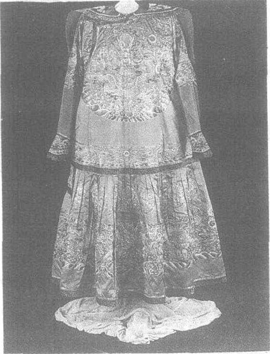 | 释义 | 乾隆皇帝月白缎绣云龙袷朝袍 乾隆皇帝月白缎绣云龙袷朝袍清。身长143厘米,两袖通长194厘米。北京故宫博物院藏。这件朝袍由披领、上衣、衣袖、罗纹素缎接袖、马蹄袖端、腰围、襞襀、衽、裳等组成。朝袍在蓝白色的朱子底绢上绣有43条龙纹和12章纹,在金色龙纹的间隙,还穿插有云纹、蝙蝠、暗八宝纹、寿字纹,并在每个主要装饰部位的周围饰有水浪纹、寿山纹,并夹有合称八宝的金锭、银锭、珍珠、犀角、如意、方胜、珊瑚、钱纹,交互配置金丝和白金线。配色采用三晕色,有红、粉红、水粉、蓝、浅蓝、月白、深绿、浅灰、浅雪灰、白色等,再加捻金线勾边,并利用了绢的光泽及朦胧手法的巧妙运用,使色彩更加华丽。袍里衬以湖色暗花四枚缎纹绫。朝袍的大襟纽扣上系有黄签条,一面写有“绣月白缎面片金边袷朝袍一件”,另一面写“高宗”字样。