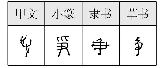 【提示】,不要依旧字形写成 。 , 有插笔穿过时中间的横笔右端出头,不要错写成彐。 *争zhēng6画 刀部 (1) 力求获得或夺得:~夺|~取|~光|~先恐后|分秒必~。 (2) 较量;竞争:~斗|战~| ~个高低|鹬(yù)蚌相~。 (3) 由于观点、意见不同而相互辩论:~吵|~论|~端|~辩|意气之~。 争zhēng小篆以来作爭。从爪,下从又(手)持一物(一弧线)。象两人用手争夺一物状。是争夺,夺取义。是力求获得,互不相让。如:争夺|争先恐后|争论。组词如:斗争|争斗|战争|竞争。现规范字形作争。爪字头从简。晋代行草书已如此。如稳隐右上角爪字简化在唐代也已有。引申为争执。如:意气之争。中古以后在诗词曲中为“怎么,如何”义。如:争不|争知|争奈。 争爭◎常★常◎异