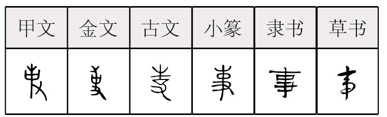 【提示】 , 有插笔穿过时中间的横笔右端出头,不要错写成彐。 *事shì8画 一部 (1) (~儿)职业;工作: 设法谋~|他在一家公司做~。 (2) 事情: ~实|时~|~在人为|新人新~。 (3) (~儿)事故;意外的损失或灾祸: 失~|平安无~|井下出~了。 (4) 关系或责任: 这回可没有老李的~。 (5) 做;从事: 不~生产|无所~事。 (6) 〈书〉侍奉: ~亲最孝。 事 ☚ 史 支部 ☛ 事shì甲骨文象手(又)执做事之物形。表示做事。与吏、使等为一字,吏就是做事的人。又通史字。周代金文、石鼓文及《说文》所载战国文字等,事字也写作吏字。吏与事古代声母都是舌尖音,韵母相同。如吏使、丽酾曬(晒的异体字)例。指做,治。如:不事生产。旧指侍奉。转为名词,指事情,自然界和社会中的一切现象和活动。组词如:事情。又指关系或责任。如:走吧,没事了。又指变故。如:出事|平安无事。组词如:事变|事故。又指职业。如:他现在做什么事? 事★常◎常