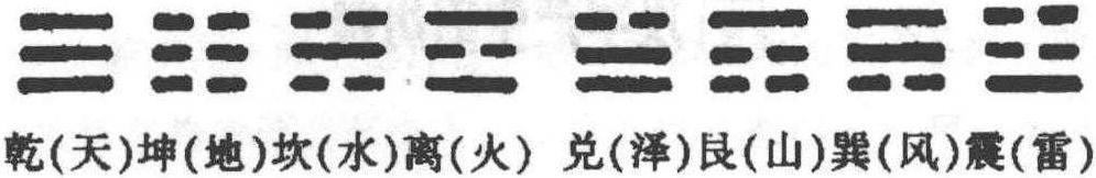 图2—5 八卦及其含义 八卦是古人用来占卜的八种基本符号,其中任意两卦相迭,就可得八八六十四重卦。其中 为阳爻, 代表奇数, ⚋为阴爻, 代表偶数。 占筮时, 筮者用49根蓍草茎(古称 “算筹”)按某种法则进行演算,得数只有六(老阴)、七(少阳)、八(少阴)、九(老阳)四种可能性。凡老阳少阳都用阳爻表示,老阴少阴都用阴爻表示。这样演算三遍得一单卦,演算六遍得一重卦。反复演算,就能有八种排列和组合,即: 奇奇奇、偶偶偶、奇奇偶、奇偶奇、偶偶奇、偶奇偶、奇偶偶、偶奇奇,也就是八卦。筮者再根据重卦的卦象爻象分析,并结合 《易辞》 以占测吉凶祸福。考古发现表明,从商代、西周到春秋战国,筮占是用一、二、三、四、五、六、七、八、九等数字表示的,后来用一、八来表示,一演变成了阳爻,八演变成了阴爻。《易经》对八卦有系统的论述。[12]由此可知,八卦的卦爻与数有关。八卦用算筹进行演算。从甲骨文的数字看,八以内的数似乎都是用一至四根算筹摆成的 (见图2—6) :