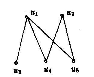 设G= 是无向图. 若G的点集V=T∪S,T∩S=φ,并且,T的点只与S的点邻接,S的点只与T的点邻接,则G称为二分图(二部图、偶图、双图). 记做G: . 例如,G1,G2都是二分图,G1= < {v 1,v 4 ,v5,v6},{v2,v3,v7,v8}; R>,而G2 < {u1,u2 },{u3,u4,u5}; E>.