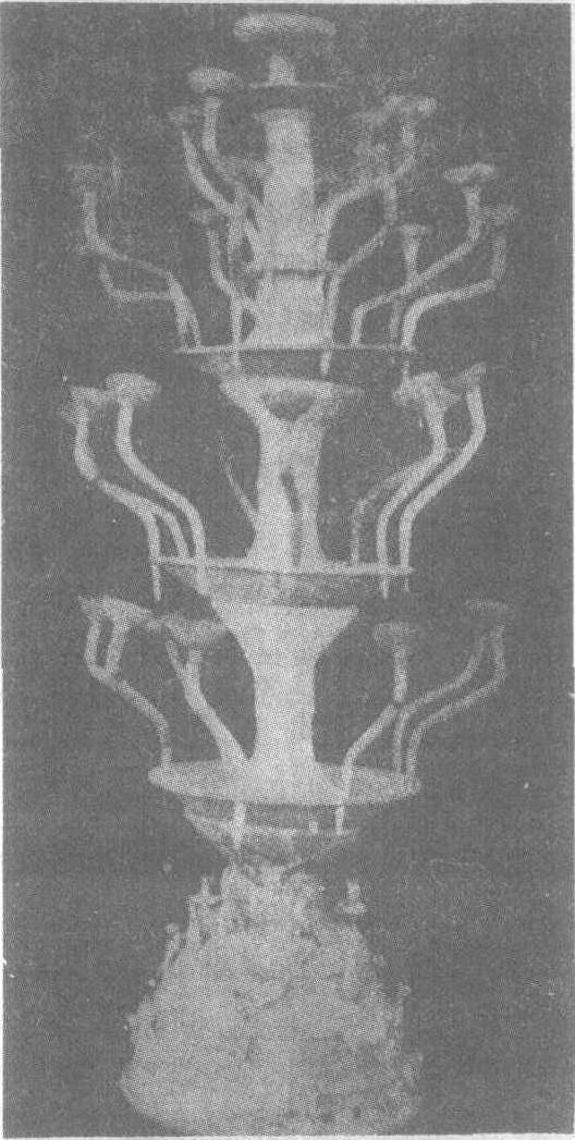 | 释义 | 二十九枝连盏陶灯 二十九枝连盏陶灯汉。高142厘米。1985年河南省济源县承留乡出土。陶连枝灯多出土于东汉墓中,但如此高大,灯盏多达29枝的较为少见。全灯由盘、柱、盏、座组成,通体以白衣装饰,涂有朱砂,灯盘为浅腹式,平沿上均有8个圆孔,用以插灯盏。灯盏则以曲柄支撑。此外上部灯柱的腰沿处另有4个插灯盏的圆孔。灯座类似腰鼓形,上有四组雕塑图案,有捧桃的人物,山峰以及奔跑的鹿、羊、兔等动物,极富生活情趣,装饰性亦强。