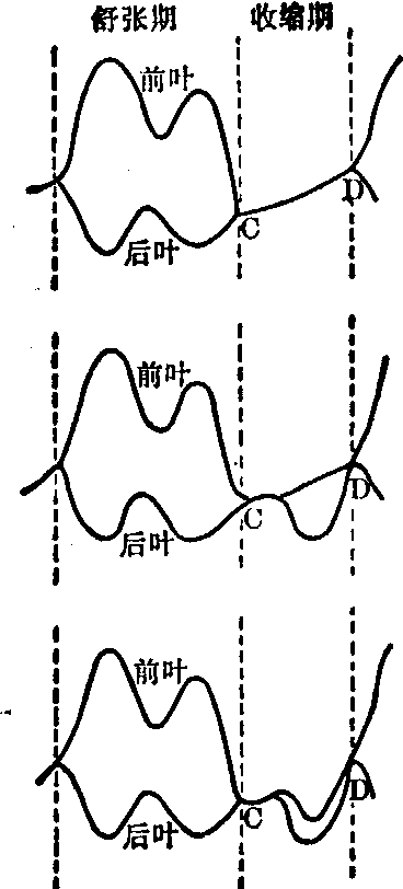 (3) 超声心动图: 为诊断二尖瓣脱垂很有价值的无创伤性检查方法,在心室收缩期二尖瓣关闭 (二尖瓣前叶与后叶合拢),在M型超声心动图曲线上形成共同的CD段,此段正常时为缓慢上升的直线。二尖瓣后叶脱垂时(较常见),收缩中、晚期后叶向后移位和前叶分离,呈“吊床样”波形,在D点又与前叶合拢,左心房后壁可见脱垂后叶回声; 前叶脱垂时,可见二尖瓣前叶活动曲线幅度明显增加,左心房内可见脱垂前叶回声(图)。脱垂发生和喀喇音在同一时间,如心音图与超声心动图同时记录,可增加诊断的可靠性。诊断 二尖瓣脱垂的诊断,虽然由于左心室造影和超声心动图检查的广泛应用取得了很大进展,但缺乏为大家所一致接受的诊断标准,所以仍然存在不少困难。