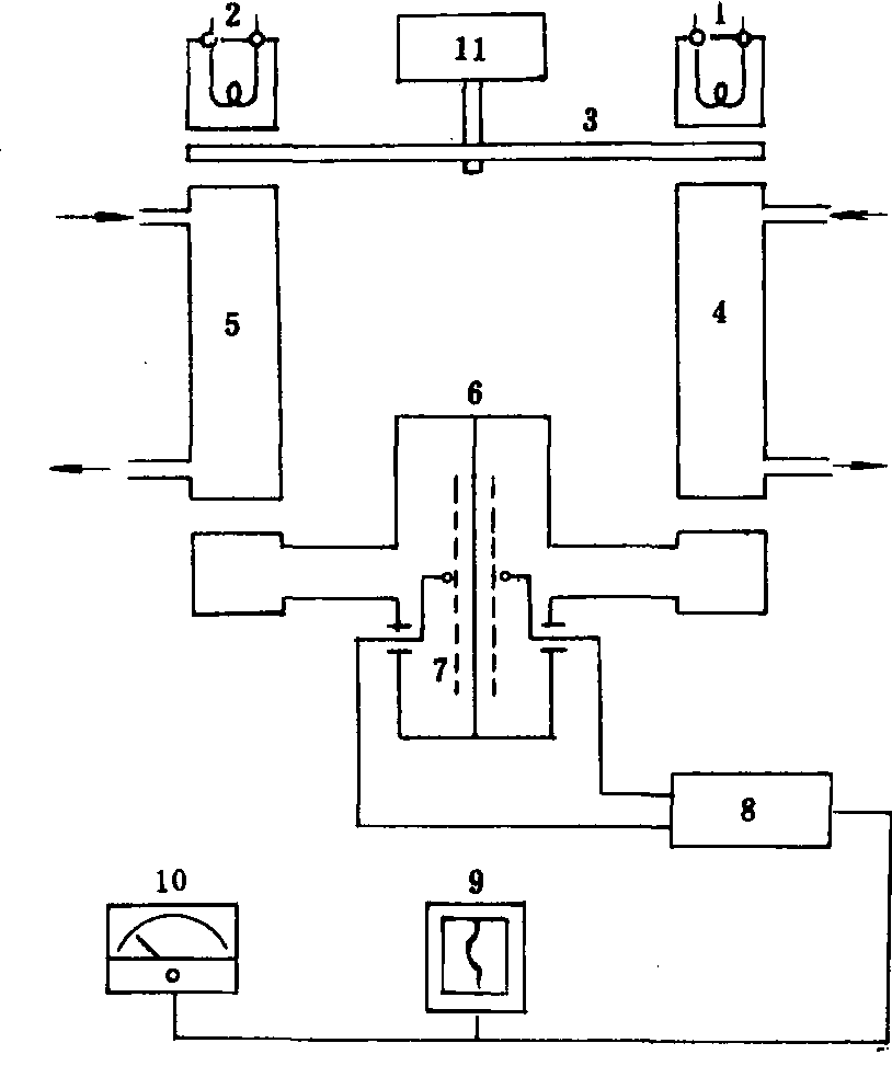 图2 双气路型CO2红外气体分析仪示意图 双气路型 图2中1和2表示两个波长和强度都相同的红外辐射源,一般由红外灯泡和光学滤光片组成。红外灯泡所产生的红外辐射,波长范围较宽,经过滤光片后,即变成了波长4.26微米的红外平行光束。红外光束1通过对比管到达检测器6,对比管4是密闭的,管内充满已知浓度的标准气体,例如纯净的N2。管内CO2浓度接近于零,不吸收4.26微米波长的红外辐射,因此检测器右边得到的能量相当于公式(2)中的E0。红外光束2通过试样管5时,一部分能量被流动空气样品中的CO2气体所吸收,因而到达检测器左边的能量,就相当于公式(2)中的E,显然检测器两边接收的能量不等,其差值相当于△E。检测器是个薄膜电容器,通过汇集膜7,它把△E变成电迅号,并送到信号放大器8加以放大,再经检波整流以后由显示器直接显示CO2的浓度。显示器可以是电流表或自记电位差计9,也可用数码显示10并配备数字打印机。旋转遮光器3是一块由同步电机11驱动、其扇形角为90°的双扇形黑色薄板,两扇形相距亦为90°,它以恒速转动,薄板转动一周使光路各通断两次。就这样把原来两个光路所形成的直流信号变成了断续的脉冲信号。因为放大交流信号比直流信号方便,也比较准确, 精度高。 单气路型 结构简单,体积和重量都小,便于携带,它只用一个气室和一个红外辐射源。红外源放在一个受同步电机带动的圆形调制筒内,筒上开有6个窗孔,沿圆周均匀分布,互差60°;孔上装有A、B两种滤光片各三片,A.B相间排列, A型片只允许4.26微米波长红外光通过: B型片只允许CO2不吸收的红外光通过。于是,当调制筒转动时,就会有CO2能吸收和不能吸收的两种红外光束交替通过测量气室,室内流动空气中的CO2将吸收其中一种光束的部分能量:因此,接收到的能量也交替为E和E0,其差值就是△E。所以, 调制筒每转一周,就可得到三个△E值。如此循环往复,可得到较为准确的CO2气体含量。 注意事项 ❶要除尘除湿。由于水汽分子是偶极子,也强烈吸收红外线,除湿不尽会严重影响CO2气体的测量准确度。尘埃中的杂质,有一些能吸收红外线,也会干扰测量结果。 ❷防止人为影响。人体在日常呼吸中呼出CO2,不注意也会影响测量结果。另外,还要注意空气密度变化对CO2浓度的影响。在精密测量时应考虑温度和气压的订正问题。 ❸经常注意仪器的校准。仪器在使用一段时间后,可能发生某些性能方面的变化,影响测量的准确度。 |