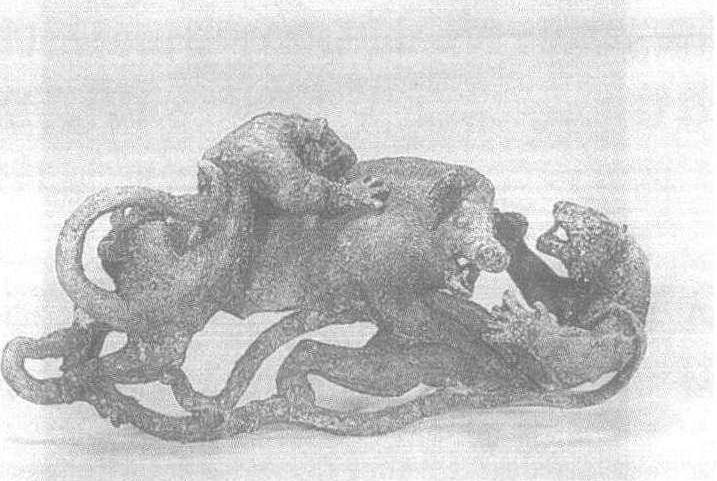 这件铜雕饰就是汉代被称为 “西南夷”——滇人的杰出创造。它出于云南滇地之南的晋宁石寨山古墓,距今已2000多年。滇人有悠久的历史,汉武帝在益州设郡之前,就已跨进奴隶制的门槛,并创造了富有地域特色的青铜文化。滇池周围古墓群出土了时代相当于中原战国至汉的铜鼓、铜祭器、铜贮贝器、铜兵器,上面饰有人物、动物形象,生动地反映了当时祭祀、战争、歌舞、狩猎等情形。其中一些以表现猛兽搏斗的铜饰尤为精彩。这件二豹搏猪是其中的 一件,为透雕。展现在观众面前的是激烈厮杀的场面,显然战斗已进入白热化阶段,两只豹子张牙舞爪,一前一后开始最后的围歼。在腹背受敌的严峻形势下,那野猪也豪不示弱,张着大嘴,露出獠牙,向前面的豹子猛冲过去。这胜败的较量、生死的搏击,是如此惊心动魄,仿佛把观赏者也带进了远古的现场。这件作品虽然不大,却有小中见大的艺术魅力。作者在把握豹子与野猪搏斗的瞬间动作以及对矛盾双方的性格塑造都取得了很大的成功。