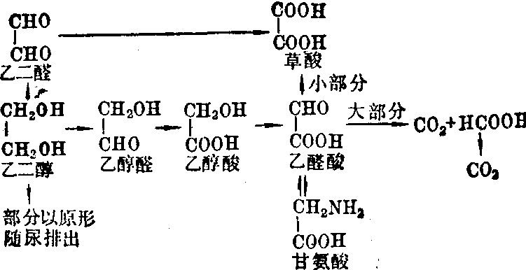 乙二醇体内代谢过程 乙二醇的代谢与染毒量有关。给兔经口或皮下注射14C标记的乙二醇0.1~2.0g/kg后,在1~11天内经尿排出的14C占染毒量的17~28%。在1和3天内呼出的14CO2分别占42%和60%。染毒剂量增至2.5~5.0g/kg时,则在1和2天内由尿分别排出46%和56%。可见剂量加大后由尿排出的百分比明显增高。尿中排出的主要是乙二醇原形。至于草酸盐在尿中的排出量则因动物种类而异。 乙二醇的中毒机理尚未完全明瞭。目前认为中毒的早期症状是由于抑制中枢神经系统所致。在后期,则乙二醇的氧化代谢产物可引起肾脏改变,长期以来认为是由于氧化产物草酸盐阻塞肾小管所致。但晚近证明,肾脏改变并不一定伴有草酸盐沉积。在体内氧化代谢形成的其他一些含醛基的中间产物如乙醇醛、乙醛酸等,毒性都比乙二醇大。它们可抑制氧化磷酸化、葡萄糖代谢和蛋白质合成。这些醛类物质能与含巯基的酶和蛋白质的氨基酸起反应,并能特异地抑制中枢神经系统的呼吸和5-羟色胺代谢。所以乙二醇的毒作用可能由草酸、氧化中间产物和乙二醇本身引起。 防止误服。在工业生产中应避免皮肤长期接触本品,以防止经皮吸收中毒。急性乙二醇中毒时用乙醇治疗有效。乙醇可能在体内与乙二醇竞争醇脱氢酶,从而阻碍乙二醇的氧化,使之呈原形排出,以降低其毒作用。 维生素B 和维生素B1是乙二醇分解为毒性低于草酸的产物所需的两个辅助因子,可于早期大剂量应用。属于二醇类的物质尚有丙二醇类、丁二醇类、已二醇类等多种化合物,其中除苯乙二醇及平均分子量≥1000的聚乙二醇类为固体外,余均为液体。经口毒性均为低毒或微毒。二乙二醇曾因用于配制内服药而致中毒。除乙二醇外,均无生产性中毒的报道。 ☚ 醇类 环氧化合物 ☛ |