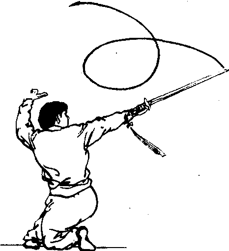 ❶以臂带剑,翻腕转臂,剑、臂同时云绕。