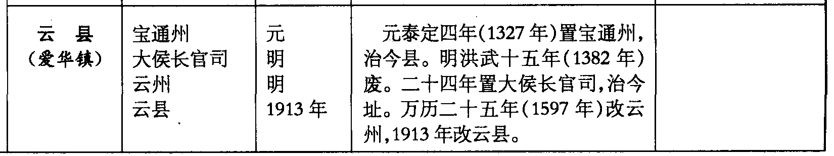 云县(爱华镇)宝通州大侯长官司云州云县元明明1913年元泰定四年(1327年)置宝通州,治今县。明洪武十五年(1382年)废。二十四年置大侯长官司,治今址。万历二十五年(1597年)改云州,1913年改云县。