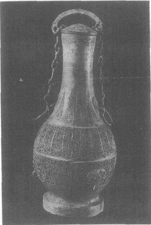 战国。盛酒器。通高37厘米,腹径17厘米。1957年湖南省长沙市烈士公园出土。湖南省博物馆藏。此壶小口,长颈,有链式提梁。口上有小圆盖,两侧各有一铺首钮,贯环。肩部饰三角云纹,两侧亦各有一铺首衔环,并有链与盖环相连。膨腹,圈足。腹饰以席纹为地的变形云纹,下部有三个兽面,但不衔环,非常少见,可能是为系带之用,便于提携。