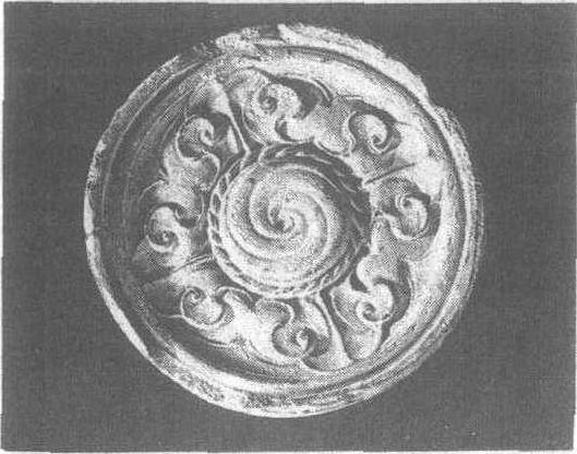 ☚ “羽阳千岁”瓦当 鹿纹瓦当 ☛ 云纹瓦当 云纹瓦当yunwen wadang❶秦代瓦当。1974年秦咸阳一号宫殿遗址出土。当径15.5厘米,轮宽1厘米。轮内饰单线弦纹。绳纹中心圆内饰一突起乳钉。内外圆之间上下三线、左右双线栏界将当面分成四格,格内分饰四组云纹。纹间有一乳钉。现藏咸阳博物馆。 ☚ 云阳镇中共陕西省委旧址 云纹瓦当范 ☛ |
