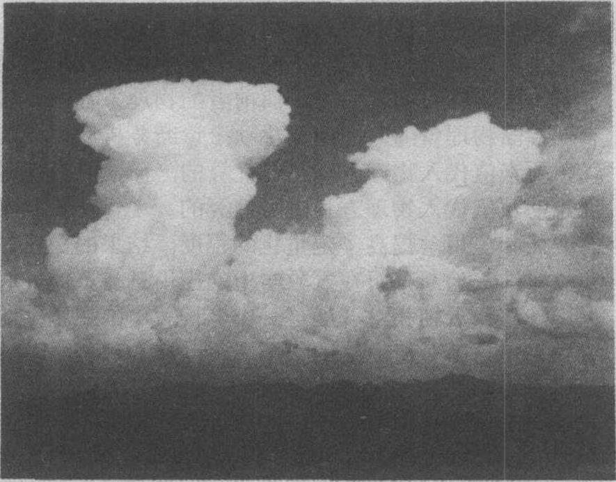 垂直发展的对流云,云底较低而云顶可以发展到对流层顶。图中示强对流云(浓积云→积雨云)在17分钟内的三帧图象。