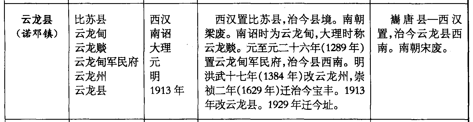 云龙县(诺邓镇)比苏县云龙甸云龙赕云龙甸军民府云龙州云龙县西汉南诏大理元明1913年西汉置比苏县,治今县境。南朝梁废。南诏时为云龙甸,大理时称云龙赕。元至元二十六年(1289年)置云龙甸军民府,治今县西南。明洪武十七年(1384年)改云龙州,崇祯二年(1629年)迁治今宝丰。1913年改云龙县。1929年迁今址。巂唐县—西汉置,治今云龙县西南。南朝宋废。