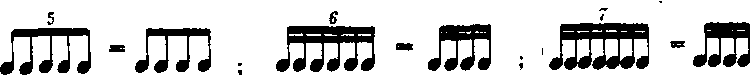 节奏划分的特殊形式。用同等时值的五个音符代替同等时值的四个音符,便形成了五连音。(若用六个或七个音符代替四个音符便形成六连音或七连音)记谱时在组成5 (或6、7)连音的音符上方或下方用数字5 (或6、7)来表示。如: