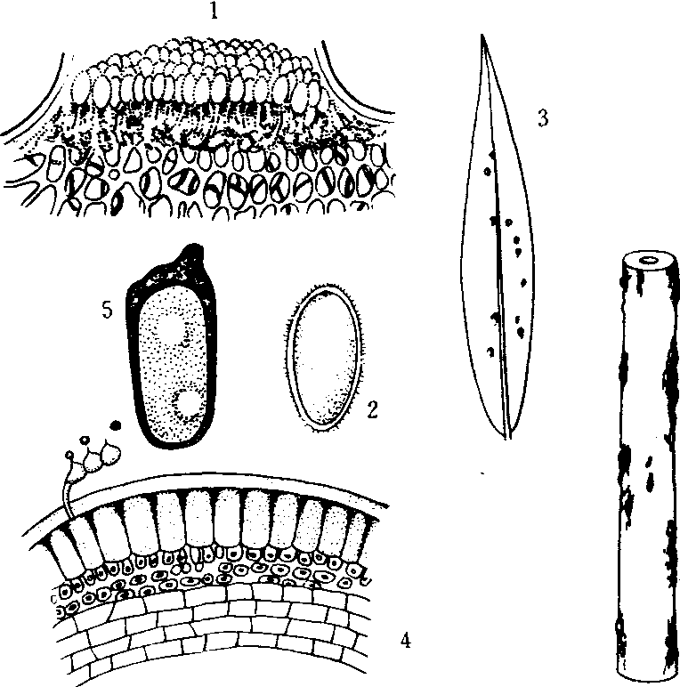 亚麻锈菌 1.夏孢子堆; 2.夏孢子(放大); 3.亚麻叶上夏孢子堆;4.冬孢子堆及萌发的担孢子; 5.冬孢子(放大); 6.亚麻茎上冬孢子堆 侵染过程和病害循环 病菌以冬孢子在土中的病残体上或混种子中的病组织碎片中越冬,翌年春季萌发产生担子及担孢子,以担孢子侵染幼苗的茎叶,以后形成性子器,再产生锈子腔及锈孢子。锈孢子借风雨传播侵染茎、叶、花序、小枝及萼片。后形成夏孢子堆,夏孢子藉风传播并从气孔侵入,进行重复侵染。夏孢子对病害的传播作用最大。生长后期形成冬孢子。 病害防治 种植抗病品种是控制该病的最有效措施,目前中国推广的黑亚5号和6号属高抗品种,流行年份仍可保产。严格执行检疫制度,严防新小种传入。实行轮作,或收麻后清除病残,同时选无病地留种,减少初侵菌源。加强培管,包括适时早播,避免施过多氮肥,增施钾肥,开沟排水,均可减轻发病。发病初期喷布萎锈灵或敌锈钠。 亚麻锈病flax rust亚麻的重要真菌病害。病原菌是担子菌亚门的亚麻栅锈菌〔Melampsora lini (Ehrenb) Lév.〕。叶、茎、花梗及蒴果均可危害。春季在被害叶片和茎秆上产生黄色小点(病菌的性子器和锈子腔),后在叶、茎和塑果上产生红黄色夏孢子堆,成熟期,在叶、茎和蒴果表皮下产生黑色有光泽的冬孢子堆。冬孢子堆不突破表皮。病菌以冬孢子在病残体上或种子表面越冬,田间以夏孢子借风雨传播进行再侵染。冬孢子经-20~-30℃低温刺激后才能萌发,产生担子及担孢子侵染麻苗。多雨高湿天气有利于发病,种植过密发病重。选用抗病品种、轮作、加强田间管理和喷洒药剂可减轻危害。 亚麻锈病flax rust |