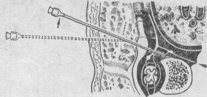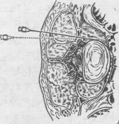 图2 胸交感神经节封闭术进针的横切面 (3) 腰交感神经节封闭术(图3): 目的是阻滞下肢的交感神经。其方法是经腰椎旁穿刺腰2~4交感神经节,注射药物以封闭下肢的交感神经。患者侧卧,患侧在上。在腰椎2~4棘突上缘,离中线4cm处,用甲紫溶液作三个进针点标志。皮肤消毒铺巾后,在进针点用1%普鲁卡因作皮丘。取10cm长的22号针在进针点垂直刺入。针尖触及相应的横突后,将针拔出少许,略向头端和内侧倾斜刺入,越过横突上方,刺到椎体外侧面。再将针拔出少许,稍稍向外侧深入,使针尖刚好滑过椎体的前外侧面,穿刺深度离横突不超过4cm。腰交感神经节在椎体的前外侧,在其稍前方,左侧为腹主动脉,右侧为下腔静脉。为避免损伤这些大血管,穿刺时针头必须紧靠椎体,在刚滑过椎体后,就不宜将针刺入过深,一般不能超过1cm。抽吸证实无血液或脑脊液后,在每一穿刺点注入1%普鲁卡因5ml。注药后5~15分钟,注射侧的下肢有发热感,表面温度增高、血管扩张和汗闭等现象。