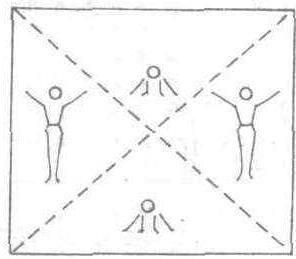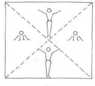 是指表演者按行、排、小组或区域分成单、双数组,在规定的节拍内轮流交换着完成同一个但方向相反的动作。如图是将一个散点队形划分成前后和左右各相对称的两个三角。前4拍,前后两三角的表演者做站立同时两臂侧上举的动作;而左右两三角的表演者则做下蹲同时两臂侧下举手撑地的动作。后4拍互相交换,循环2~3遍即可如图1和图2。