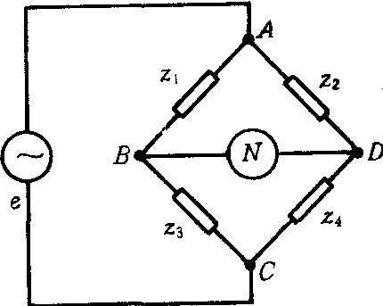 四个桥臂由复阻抗组成,由交流电源供电并用耳机和其他仪器作平衡指示器的电桥。如图1,电桥平衡指每一时刻B、D两点的电势差均等于零,因而要求B、D电势的幅值和位相均相同。交流电桥平衡条件为:Z1Z4=Z2Z3,此式为复数等式,所以要求模与辐角分别相等,即:z1z4=z2z3,ᵠ1+ᵠ4=ᵠ2+ᵠ3。交流电桥可以独立使用,也可与振荡、放大、指示等元件组合,构成一个完整的测量仪器,以测量电阻、自感、互感、电容或测量其它一些参量(如电频率、介质损耗等)。交流电桥也可做为自动调节、自动控制的部件。