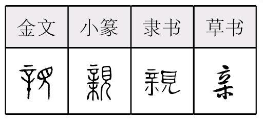 西周金文从见(見),辛声。声母演变为旁纽双声,如心沁(qìn)、肖悄俏峭例。战国以后从亲声,或增从宀(mián)。亲字西周以来从木、辛声。即榛的本字。隶楷親旁简化作从立在木上。元代以来就以亲为親的简化字。现以亲为親的规范字。親为繁体字。见《总表》。亲本指感情深厚,关系密切。如:兄弟相亲。组词如:亲密。引申指亲属。如:亲人|亲兄弟。特指父母。如:双亲。又指婚姻。如:亲事|定亲。旧特指新妇。如:娶亲。指亲戚。如:姑表亲。组词如:亲属|亲家。又引申指本身,自己的。如:亲笔|亲朋|亲手。又引申指用脸接触。如:亲一亲小孩。(亲家的亲韵母变后鼻韵因家古音方音声母作g-,亲韵母受同化作用而变。)
