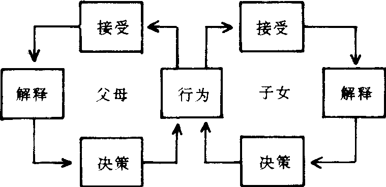 即父母与子女交往中的相互影响过程。以往人们在研究亲子之间的交往时,比较强调父母一方的主动性,仅将子女视为父母影响的被动接受者。近年来的深入研究表明,子女,即使是刚出生不久的婴儿,也是亲子交往中的积极支持者、维护者,甚至是发动者。比如,不足一个月的婴儿已能对父母的微笑、抚摸和语言作出明显的反应,他们会注视父母的眼睛,对之微笑,喃喃作声并且“手舞足蹈”。孩子的这种行为无疑会进一步唤起父母的怜爱之心,促使他们继续与孩子交往。根据这种情况,可以绘制出亲子互动行为模式图如下:如图4.1-3所示,亲子交往中,任何一方的行为(包括语言、表情、动作等)都会引起另一方的注意(接受)。然后,接受者根据自己对这种行为的理解(解释)作出如何反应的决定(决策),并付之于行动(行为),而这一行为又为对方所接受,引起一系列反应活动……。由此可见,亲子之间是一种双向的相互影响的关系:一方面,父母对子女的态度和教养行为会影响子女对父母的情感态度,会影响子女的行为和发展;另一方面,子女的行为又会影响父母的态度和教养行为。