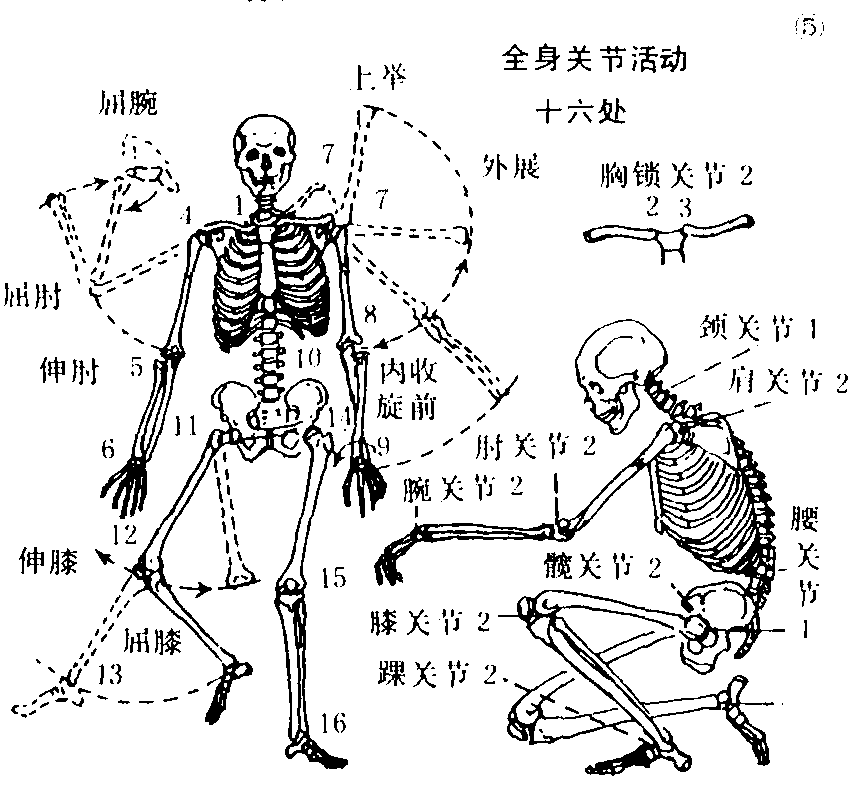 人体的运动姿态,主要决定于全身骨骼结构的16处关节活动。要注意每一处关节活动都有一定的规律和局限范围。头:只能转到肩前为止。脊柱:颈部能低头、抬头,腰部能弯曲和侧屈角度较大。上肢:肩关节能作多种活动,但后伸受到限制。肘部前屈角度大,后伸至直为止。手腕内收角度大,外展角度小。手指屈度大,伸只能平直。下肢:髋关节能作多种活动,后伸、外展稍受限制。膝关节向后屈度大,伸只能大腿、小腿平直为止。脚踝左右活动不大,足腕前屈小后伸大,伸能使足背与小腿平直。足趾屈度大,伸能两趾平直(见图6❺)。