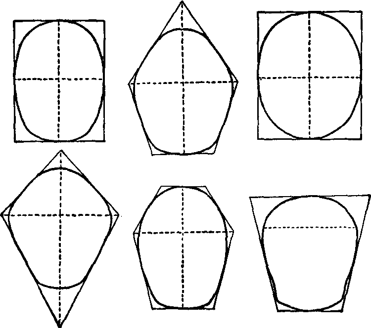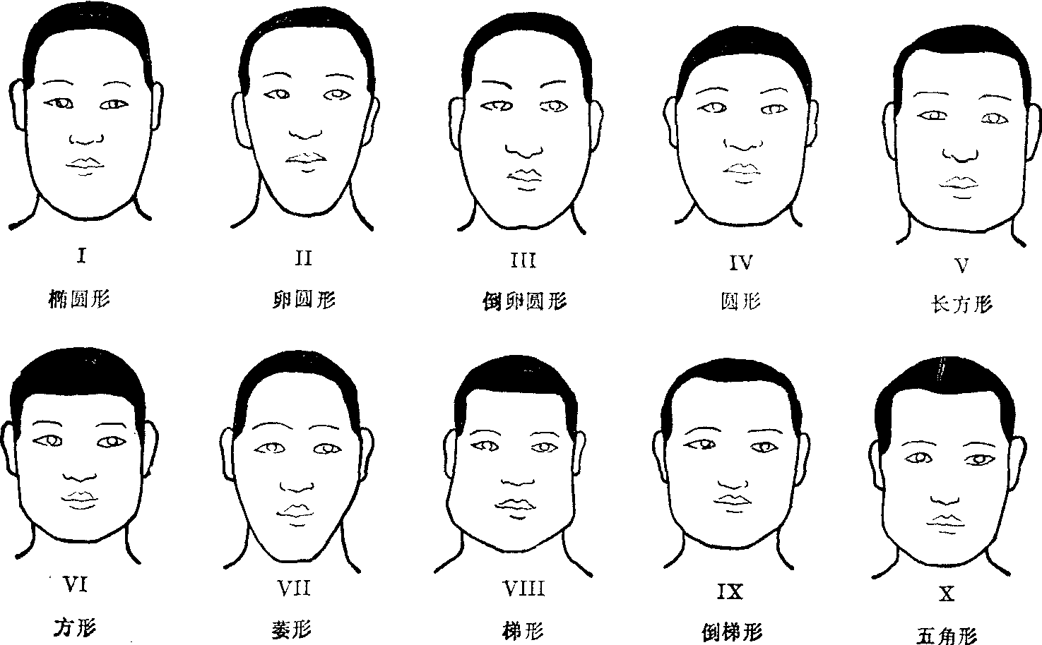 图1 颅形模式图 ❹菱形: 颅骨最大宽在后1/3处,其明显特征是顶结节特别发达,向外凸出,额部较窄的颅形。 ❺卵圆形:颅最大宽在后1/3处,顶结节和额结节不明显,较平缓,颅的后部较前部为宽的颅形。 ❻楔形: 颅骨最大宽在颅后1/3处,整个颅形似卵圆形,但主要区别在于枕部较平。 另外,在人类学研究工作中,常采用数字确定颅形,国际通用的是颅长宽指数、颅长高指数和颅宽高指数。 颅长宽指数: 颅长宽指数=颅宽 (eu-eu) × 100/颅长(g-op)。根据指数将颅分为7型: 超长颅型(ultradolichocrany) x~64.9 特长颅型 (hyperdolichocrany) 65~69.9 长颅型 (dolichocrany) 70~74.9 中颅型(mesocrany) 75~79.9 圆颅型(brachycrany) 80~84.9 特圆颅型(hyperbrachycrany) 85~89.9 超圆颅型(ultrabrachycrany) 90以上 颅长高指数:颅长高指数=颅高(ba-b) × 100/颅长(g-op)。根据指数把颅分为3型: 低颅型(chamacrany) x~69.9 正颅型(orthocrany) 70~74.9 高颅型(hypsiorany) 75以上 颅宽高指数: 颅宽高指数=颅高(ba-b) × 100/颅宽(eu-eu),依指数把颅分为3型: 中颅型(metriocrany) 92~97.9 狭颅型(acrocrany) 98以上 面形 面形包括颅骨面形和活体面形。在颅骨上观察面形不易确定其形状,只能大概叙述面部是低而宽,或长而狭。但是,正确地划分面型,一般常用两个面指数。 全面指数:全面指数=全面高(n-gn)×100/面宽(zy-zy)。依指数面型分为: 特阔面型(hypereuryprosopy) x~79.9 阔面型(euryprosopy) 80~84.9 中面型(mesoprosopy) 85~89.9 狭面型(leptoprosopy) 90~94.9 特狭面型(hyperleptoprosopy) 95以上 上面指数: 上面指数=上面高(n-pr)×100/面宽(zy-zy)。依指数把面型分为: 特阔上面型(hypereuryeny) x~44.9 阔上面型(euryeny) 45~49.9 中上面型(meseny) 50~54.9 狭上面型(lepteny) 55~59.9 特狭上面型(hyperlepteny) 60~x 活体上观察面形较骨胳上容易,主要从前面观察其自发缘以下至下颌颏部的整个面部形态,一般分为10个类型(图2):