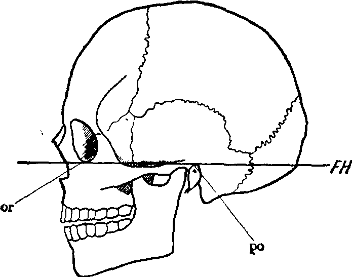 图1 Frankfort平面(眼耳平面)示意图 颅骨主要测点 (1)眉间点(glabella,g),左右眉嵴之间(眉间区)在矢状面上最向前突出之点,大致位于鼻额缝的上方。当眉间区十分平坦,不易确定此点时,可借助两侧眉弓的趋势予以确定。 (2)额结节中点(metopion,m),两侧额结节最突出点的连线与正中矢状平面相交之点。 (3)前囟点(bregma,b),矢状缝与冠状缝相交之点。如果因骨缝扭曲而使此点偏离正中矢状面,则以二缝的主轴相交点为前囟点。 (4)颅顶点(vertex,v),颅骨位于Frankfort平面时,颅顶在正中矢状面上的最高点。 (5)人字点(lambda,1),矢状缝与人字缝相交之点。当骨缝扭曲或有顶间骨时,以二缝主轴的相交点为人字点。 (6)颅后点(opisthokranion,op),正中矢状面上颅骨最向后突出(离眉尖点最远)之点。该点通常位于枕外隆凸的上方,可在测量颅最大长时确定此点。 (7)枕外隆凸点(inion,i),枕骨上项线与正中矢状面的交点。当上项线不明或枕外隆凸不显著时,可在枕外隆凸下面向颅底转折处取得此点。 (8) 大孔前缘点(endobasion,enba),枕骨大孔前缘与正中矢状面相交最向后突之点 (即离大孔后缘点最近之点)。 (9)颅底点(basion,b),枕骨大孔前缘与正中矢状面相交最低之点,位于大孔前缘点的上方。 (10) 星点(asterion,ast),人字缝、枕乳缝、顶乳缝三者相交之点。有缝间骨存在时,以三缝主轴的汇合点为星点。 (11)外耳门上缘点(porion,po),外耳门上缘的中点,即假设的平分外耳门为前后两半的垂线与外耳门上缘的交点。在外耳门后上缘有一斜行的小骨棘,确定时可以该骨棘的基部作为外耳门后上缘的一部分,借以确定外耳门上缘点。 (12)颅侧点(euryon,eu),颅侧壁最向外突出之点。此点通常位于顶骨,少数位于颞骨鳞部上分;也可借测定颅的最大宽来确定此点。 (13)额颞点(frontotemporale,ft),额骨颞嵴上与对侧颞嵴距离最近之点。 (14)鼻根点(nasion,n),鼻额缝与正中矢状面相交之点。如果两侧鼻额缝高度相差过大,则取其平均位置以确定该点。 (15) 鼻棘点(nasopinale,ns),梨状孔左右二半下缘最低点的切线与正中矢状面相交之点。如果梨状孔下缘有鼻前窝或沟存在,以致难以确定该点,则可以参照鼻腔底的水平予以确定;如果鼻前棘很高,则可以在其侧面位置确定该点。 (16)上牙槽前缘点(prothion,pr),上颌两中央切牙之间最向前突的一点; 它与以下的上牙槽点有区别。 (17)上牙槽点(supradentale,sd),上牙槽突前面两个中央切牙之间最下突之点。 (18)上颌额点(maxillofrontale,mf),眶内侧缘与额颌缝相交之点。如果眶内侧缘中段圆钝而不易定点,可由眶内侧缘的下段向上延展,予以确定。 (19)眶外缘点(ektokonchion,ek),与眶上、下缘大致平行而平分眶入口的直线与眶外缘相交之点。 (20) 眶下缘点(orbitale,or),颅骨位于Frankfort平面时,眶下缘最低之点。如果眶下缘圆钝,应取圆钝的中部作为眶缘,不可偏向眶内或眶外。 (21)颧颌点(zygomaxllare,zm),颧颌缝的最下之点。如果该缝最低处是一条线,则以该线的最前点为颧颌点。 (22)颧点(zygion,zy),颧弓最向外突出之点。两中央切牙之间最向上突的点。 (24)颏下点(gnathion,gn),下颌骨前下缘与正中矢状面相交之点。 (25)颏前点(progonion,pg),下颌联合下部在正中矢状面最向前突出之点。 (26) 下颌角点(gonion,go),位于下颌骨外面,下颌体下缘与下颌支后缘相交处的最下最后和最向外突之点。 颅骨主要径线测量方法 (1)颅长(g-op),即眉尖点至颅后点在矢状面上的最长径。用弯脚规测量。将弯脚规的一端贴于眉间点,另一端沿着颅后正中矢状面方向上、下移动,以取得颅骨的最长径。 (2)颅宽(eu-eu),即两侧颅侧点之间的距离,与正中矢状面相垂直。用弯脚规测量。 (3)颅高(ba-b),用弯脚规测量颅底点至前囟点的距离。 (4)耳上颅高,颅骨在Frankfort平面,两侧外耳门上缘点连线至颅顶点在正中矢状面上的垂直距离。测量时将颅骨在Mollison定颅器上固定于Frankfort平面,然后用弯脚规移动上方的测臂使其与颅顶接触,向右移动颅骨,使测臂尖恰好落在颅骨的正中矢状面上,读出测臂的刻度即耳上颅高。 (5)最小额宽(ft-ft),即两侧额颞点之间的距离。用弯脚规或直脚规测量。 (6)颧宽或面宽(zy-zy),即两侧颧点间的距离。用弯脚规测量,尽量与正中矢状面垂直。 (7)全面高(n-gn),用直脚规测得自鼻根点至颏下点的距离。测量时用厚约2~3mm的蜡片代替下颌关节的厚度,并使上下颌牙齿按其固有的咬合斜面关系咬紧,同时记录牙齿的磨耗的级数。 (8)上面高(n-sd),鼻根点至上牙槽点的距离。用直脚规测量。 (9)面底长(enba-pr),大孔前缘点至上牙槽前缘点的距离。用直脚规或弯脚规测量。 (10)颅底长(enba-n),大孔前缘点至鼻根点的距离。用弯脚规测量。 (11)眶宽(mf-ek),用直角规测量上颌额点至眶外缘点的距离。 (12) 眶高,用直角规测量与眶宽垂直的眶上下缘入口最大径。测量时直脚规两脚触点不要在眶缘的切迹或凹陷处。 (13)眶间宽(mf-mf),两侧上颌额点之间的距离。用直脚规测量。 (14) 中面部宽 (zm-zm),两侧颧颌点之间的直线距离。用直脚规测量。 (15)下颌髁突间宽,即下颌骨两侧髁突外侧点之间的距离。用直脚规测量。注意直脚规主干应与整个下颌骨的正中线相垂直。 (16)下颌角间宽 (go-go),用直脚规测量两下颌角点