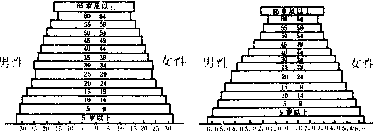 ☚ 老年人口职业构成 世界人口老化 ☛ 人口金字塔用图示办法表示人口性别和年龄构成状况,图的形状类似金字塔,也称年龄金字塔。其画法是:将每5岁或1岁划分为一年龄组,将各年龄组的男女人口数或其占总人口的百分比,分别以不同长短的条形图画在年龄纵轴的左右两侧,形成横柱形,按年龄的大小顺序自上而下在排列,便能得到一幅上尖下宽的金字塔样图形。这种金字塔形的座标图能够形象地反映一国或某一地区的人口年龄和性别构成情况。人口金字塔中所有年龄的男女人数的总和等于总人口。其形状大体有三种类型:(1)增长型,年轻人比重大,塔型下宽上尖; (2) 稳定型,除老年组外,各年龄组人数差别不大,塔形较直,只有到高龄部分突然收缩; (3)缩减型,年轻人越来越少,中年人比重较大,塔形下窄中宽。人口金字塔的用途主要是: (1) 反映人口状况。它能形象直观地显示各年龄人数的多少和相互比例,从而表明人口年轻还是年老; (2) 反映人口发展历史。人口现状是过去近百年生死累积变迁的结果,又是未来几十年人口变化的原因。人口金字塔可间接推及以往各时期的生死状况。如日本1975年25~29岁的人数最多,反映了1946~1950年间的战后出生高潮;15~24岁的人最少,则记录了50年代经济困难所导致的出生率下降。(3) 预测未来人口发展的趋势。增长型的年轻型人口,未来结婚生育的人数必然多,人口会持续增长,相反缩减型金字塔年轻人减少,中年以上比重大,人口则会降低,而稳定型的,则人口基本维持原状,变化不大。绘制人口金字塔必须精确地制定好比例,如条形的长度、宽度等,否则易得出错误信息,影响对实际情况的判断 人口金字塔 人口金字塔用类似古埃及金字塔的形象描绘人口年龄和性别分布状况的图形。能表明人口现状及其发展类型。图形的画法是: 按男女人口年龄自然顺序自下而上在纵轴左右画成并列的横条柱,各条柱代表各个年龄组。底端标有按一定计算单位或百分比表示的人口数量。人口金字塔可概括为三种类型:(1) 扩张型。年轻人口组比重较大,从最低年龄组到最高年龄组依次逐渐缩小,塔形下宽上尖。(2)稳定型。除最老年龄组外,其余各年龄组大致相差不多,扩大或缩小均不明显,塔形较直。(3) 收缩型。年轻人口组有规则的逐渐缩小,中年以上各组比重较大,塔形下窄上宽。1970年墨西哥、瑞典和捷克斯洛伐克三国的人口金字塔,就各具有上述类型的特征 (见下图):