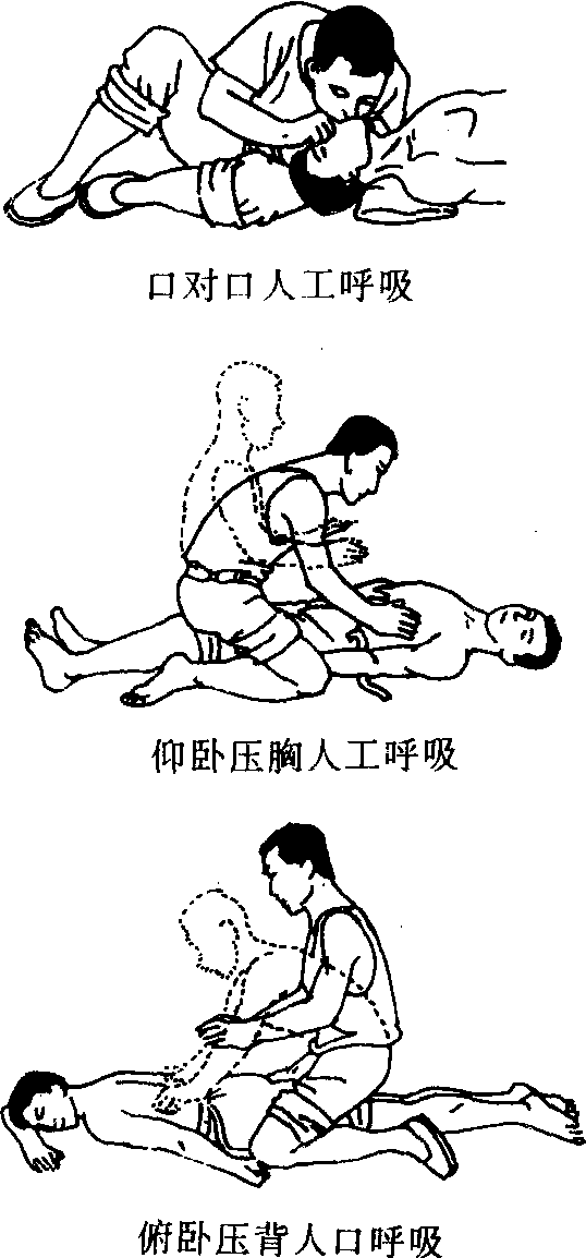 图1.6-9 常用的人工呼吸方法 ☚ 外界空气成分与压力变化对呼吸运动的影响 咳嗽与喷嚏 ☛ 人工呼吸 人工呼吸用外力使空气进入垂危者的肺,并用外力使其肺内的二氧化碳排出,以达到恢复其自主呼吸的目的。呼吸是生命存在的象征之一。呼吸中断后,脑细胞缺氧4—6分钟就会发生不可逆转的变化。人工呼吸的诸多方法中,以“口对口吹气法”,最简便、有效、实用。操作方法: ☚ 伤势轻重的判断 胸外心脏挤压术 ☛ 人工呼吸 人工呼吸rengonghuxi抢救呼吸停止及呼吸严重抑制患者时,以人工的方式维持呼吸的急救措施。广义上,人工呼吸包括器械辅助呼吸法和人工呼吸法,前者要求一定的设备和技术条件,多在医院中进行;后者无需特殊的设备和条件,方法简便,一般人均可掌握,常用于溺水、电击、中毒、工矿事故的现场急救。常用的方式方法为:口对口法、仰卧举臂压胸法及伏卧压背法。其中简单易行、效果可靠者为口对口法。具体操作方法:病人头极度后仰,一手托起下颌免除舌下坠堵塞呼吸道,然后术者深吸一口气,对准病人之口用力吹入(或可同时另一手捏住病人鼻孔),如见胸部随之扩张则为有效,如是反复进行,一般每分钟14~18次为宜。研究证实,当术者深吸气后,能使呼出气体内氧的含量达到18%,二氧化碳量降至2%,如每次保证通气量达1000毫升,则可使病人肺内氧含量接近正常范围。因此,在现场急救中宜广泛应用口对口人工呼吸法。 ☚ 煤气中毒 消化系统 ☛ 人工呼吸 人工呼吸rengong huxi用外力使空气进入垂危者的肺,并用外力使其肺内的二氧化碳排出,以达到恢复其自主呼吸的目的。呼吸是生命存在的象征之一,呼吸中断后,脑细胞缺氧4~6分钟就会发生不可逆转的变化。人工呼吸的诸多方法中,以“口对口吹气法”,最简便、有效、实用。操作方法: ☚ 伤势轻重的判断 胸外心脏挤压术 ☛ 人工呼吸artificial respiration用人工的方法使胸廓有节律地扩大和缩小,以保持肺的通气功能,称为人工呼吸。是抢救触电、溺水、煤气中毒、麻醉过深、呼吸骤停等危重病人的一种急救措施。人工呼吸的方法很多,有借助于人工呼吸机进行加压人工呼吸的;有用刺激膈神经法呼吸的;有用有节律压迫胸廓进行呼吸的;还有口对口呼吸的等,其次数应按正常人频率进行。操作时不要用力过猛,以免损伤组织。人工呼吸对抢救某些病人有重要意义。 人工呼吸用人工方法进行呼吸。常用于呼吸骤停而心搏仍存时,如溺水、电击等。方法有负压吸气式呼吸(如提臂压胸法)和正压吸气式呼吸(如口对口呼吸、人工呼吸机)。口对口呼吸最常用,病人仰卧,术者一手托起病人下颌,翻开口提出舌头,另一手捏紧鼻孔,对患者口部吹气,见胸部膨起,每分钟吹气14—16次。常需持续半小时到数小时以上才有效果。 人工呼吸呼吸停止或严重抑制时,借助急救人员、呼吸器或呼吸机所进行的呼吸。 人工呼吸artificial respiration是维持呼吸的一种急救方法。即在病人呼吸停止时,用人工方法使胸腔节律性扩大和缩小,以维持气体继续从肺进出,以改善缺氧状况,从而为恢复自主呼吸创造条件。方法有口对口吹气法、仰卧压胸法及俯卧压背法等。一般认为口对口人工呼吸法最为有效且简便易行。 人工呼吸réngōnghūxī以手按压患者胸廓,助其恢复呼吸的方法。《金匮要略·杂疗方》: “救自缢死……徐徐抱解, 不得截绳,上下安被卧之, 一人以脚踏其两肩, 手稍挽其发, 常弦弦, 勿纵之; 一人以手按揉胸上, 数动之……” 说明我国早在东汉时期已有人工呼吸法的文献记载。 人工呼吸 人工呼吸自主呼吸停止后,用人工辅助法进行通气,以维持生命的需要,称为人工呼吸。有徒手法和器械法两类,徒手人工呼吸较有效的方法是口对口法,器械人工呼吸是通过气管内插管,联接呼吸器来完成。 ☚ 心脏按压术 电击伤 ☛ 人工呼吸artificial respiration 人工呼吸artificial respiration |