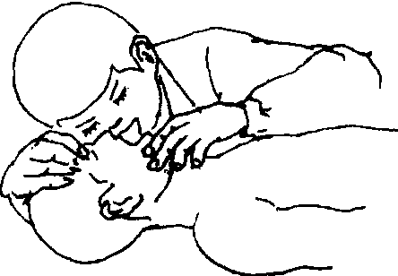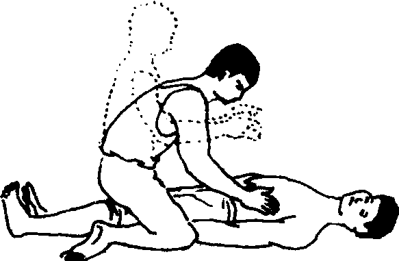 仰卧压胸法 适用于一般窒息患者, 而不适用于同时需要作心脏按摩或胸部有外伤的患者。具体方法是:患者仰卧, 腰背部垫枕或衣物使胸部抬高, 上肢放在身体两侧,头转向一侧。急救者跪跨在患者大腿两侧,两手掌贴在其两侧下胸部,向斜后上方用力将气体挤出肺脏,然后放松让胸廓自行弹回而吸入空气。如此有节奏地按压, 每分钟16—18次, 儿童18—20次 (图2)。