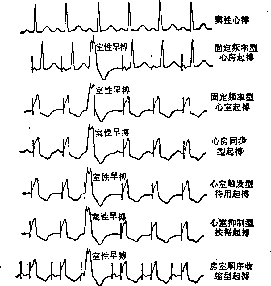 图1 各种起搏器性能示意 图示各种起搏器的起搏脉冲带动心搏时的心电图,和心脏发生自发心搏(室性过早搏动)时起搏脉冲的变化。 同步型起搏器(synchronous pacemaker) 发放起搏脉冲的规律,可根据病人自发心搏的变化而自动调整,取得同步,因而不致发生竞争心律,是起搏器的第二代产品。为适应不同病人的需要,有几种类型的同步起搏器。(1)心室同步型起搏器: 主要用于刺激心室肌,其电子线路设计使之能根据病人心室搏动而自动调整起搏脉冲的发放规律。接触心室肌的电极兼有传出起搏脉冲刺激心肌和感知心室电活动 (R波) 传入起搏器的两项功能,后者是起搏器调整脉冲发放规律的根据。有两种类型的调整方式: ❶心室抑制型按需起搏器:(ventricular-inhibited demand pacemaker,简称按需型起搏器),其特点是当病人自发的心室率慢于起搏器预先规定的起搏频率时,起搏器将规则地发放起搏脉冲,刺激心室搏动;当病人自发的心室率超过起搏器本身的频率时,起搏器的起搏脉冲就被抑制而不发放。如病人发生一次自发的提早出现的心搏,起搏器则因感知这一心搏而暂停发放一次起搏脉冲。其后如病人的自发心搏不再发生,起搏器将等待预定的一段时间(逸搏间期),再重新按其起搏频率发放脉冲。因而避免发生竞争心律(图1)。在线路设计中安排有300ms (毫秒)左右的不应期,其作用是当发放一次起搏脉冲或感知一次R波后,感知系统立即进入封闭状态,随后心脏任何电活动均不被感知,只有脱离不应期后才恢复感知。即每次发放起搏脉冲后,起搏器在300ms之内不感知,因而避免了起搏器本身激动的R波、起搏脉冲的后电位或高大T波的误被感知以致起搏脉冲受抑制而频率下降。也避免感知极早出现的过早搏动,此种过早搏动多属R波发生在T波上,常无有效的心室排血。起搏器感知病人自发心搏后再次发放起搏脉冲的间距长于起搏间期,称为“起搏器的滞后”(hysteresis)。此外,在外界持续强电磁干扰作用下,本型起搏器将转为固定频率起搏,防止受到持续抑制而无起搏脉冲发放。由于在病人自发心搏多时,本型起搏器将少发放或不发放起搏脉冲,减少电能消耗,延长使用寿命,故为目前临床上应用得最多的类型。 ❷心室触发型待用起搏器:(ventricular-triggered standby pacemaker,简称待用型起搏器),其特点是当病人自发的心室率慢于起搏器预先规定的起搏频率时,起搏器将规则地发放起搏脉冲,刺激心室激动;当病人自发的心室率超过起搏器的频率,或病人的自发心搏发生在起搏脉冲出现之前,都将触发起搏器发放起搏脉冲(提前发放),使之落在病人自发心搏的绝对不应期中,成为无效刺激,并重新安排起搏脉冲的发放,因而避免发生竞争心律(图1)。在线路设计中有400~500ms的不应期,以避免外界持续强电磁干扰的“误触发”而致快速发放起搏脉冲,或高大T波的“误触发”而致起搏脉冲在易损期刺激心肌。此外,当病人自发的心室率每分钟超过150次时(R-R间距<400ms),起搏器便不能感知每一心搏,而只感知其半数或1/3。本型起搏器的主要缺点是耗电较多,故目前较少应用。 (2) 心房同步型起搏器: 本型起搏器有两个电极,分别置于心房和心室。前者并不发放起搏脉冲而只感知病人心房的电活动,称为感知电极。后者不感知心脏的电活动而只发放起搏脉冲,激动心室,称为刺激电极。其特点是依靠病人自发心房搏动“同步”地发放刺激心室的起搏脉冲。其工作过程是: 心房电极感知心房电活动(P波)传入起搏器,经过0.12~0.20s延迟后,起搏器通过心室电极发放起搏脉冲刺激心室。因此,起搏器相当于预先安排好P-R间期的人工房室传导系统。如人工P-R间期定为0.20s,则当心脏的房室传导功能恢复正常时,起搏器仍将如常发放起搏脉冲,但落在下传心搏的绝对不应期中,而成为无效刺激。如人工P-R间期定为0.12 s,则即使心脏的房室传导功能恢复正常,起搏器仍将继续起作用(图1)。 本型起搏器有400~500ms的不应期,使之只能感知频率每分钟在120~150次以内的P波,从而将起搏的心室率也限制在此范围内,避免由于病人发生室上性快速心律失常时引起相应的快速心室率。反之,当病人出现窦性心动过缓或窦性静止,P波频率极慢时,起搏器将自动转而以每分钟60次的频率进行固定频率心室起搏。 患房室传导阻滞而窦房结功能良好的病人,最适于用本型起搏器治疗。其优点是具有同步性能因而避免发生竞争心律,心室率随心房率而变化,且使心房与心室顺序收缩,保持心房在心室舒张充盈期排血的生理功能,发挥心房应有的作用。其缺点是心房电极不易固定于心房,往往需要行开胸手术安置,故过去很少应用。近年来随着对人工心脏起搏时心房血流动力作用的重视和心房电极的改进,使用已逐渐增多。 此外,在本型起搏器中,还有一些感知心房电活动,发放电脉冲激动心房的类型,适用于窦房结功能不佳而房室传导功能良好的病人。 (3) 房室顺序收缩型起搏器(atrioventricular sequen-tial pacemaker,或称双灶按需起搏器bifocal demandpacemaker):本型起搏器有分别刺激心房和心室的电极,后者兼有感知R波的功能。有受R波抑制的心房脉冲发生器和心室脉冲发生器。前者逸搏间期较短(约600ms),后者逸搏间期较长(约840ms),两者相差约240ms。在正常工作时,起搏器经心房电极发放起搏脉冲使心房激动,在约240ms延迟后,经心室电极发放起搏脉冲使心室激动,心房和心室顺