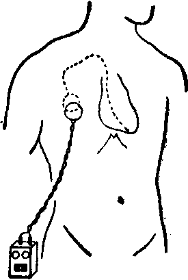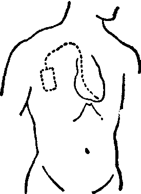 图2 体外携带式起搏器应用示意 甲: 临时起搏; 乙: 永久起搏。 (2) 体内埋藏式起搏器: 应用时置于病人体内,其脉冲发生器和电池一起用环氧树脂包埋或再加封金属外壳,故能长期置于人体内。目前所用的体内埋藏式起搏器都属小型,重量<150g,体积<60cm3,与电极导线联接后一起埋在病人胸部或腹部皮下。其优点是病人皮肤愈合后无创面,继发感染机会少,目前被广泛用于永久起搏。其缺点是起搏器发生故障时,需要施行手术才能排除,而且由于电池容量的限制,使用年数有限 (图3),到时需施行手术更换起搏器和电池。 (3) 半埋藏式起搏器: 亦称感应式起搏器。应用时电极导线和脉冲接收线圈埋于病人体内,后者多置于胸部皮下组织。脉冲发生器和电池置于体外,起搏脉冲通过置于皮肤表面的脉冲发射线圈而发放,由与之相对合的脉冲接收线圈感应后传递到心肌。其优点是体内部件埋置后无创面,继发感染机会少,脉冲发生器置于体外可以随时调整各项指标和更换电池。但因其只能作非同步起搏,故目前应用不广(图4)。