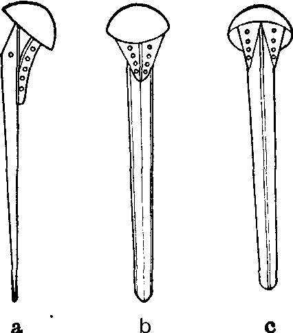 Neers型人工肱骨头 a.侧面观 b.前面观 c.后面观 人工月骨置换术 人工月骨材料,初用烯酸酯或硅橡胶,但也有用钴铬钼合金者。形态与人体月骨相同。本术适用于尚未塌陷的月骨缺血性坏死(Kienbock)病。术后绝大多数病人的疼痛可获明显改善,腕关节活动可有明显增加,但手的握力较差。常并发假体脱位或半脱位和正中神经麻痹。 人工桡骨头置换术 假体用硅橡胶制成,适应于桡骨头粉碎骨折。早期置换可恢复桡骨长度,避免下桡尺关节脱位。 形态不规则的人工骨 置换术 可分两种: ❶ 超出半关节范围而不能 用通用的人工假体置换 者,例如股骨上段,肱骨 下段,整个肱骨或股骨 等置换术。一般都在通 用的人工半关节的基础 上制成,大多采用金属 和塑料作材料,现已成功地使用钛丝织成的多孔人工骨置换一段长骨。本术适应于超过半关节范围的良性或低度恶性骨肿瘤,广泛性纤维化骨炎,以及放射治疗后病理骨折等。并发症有感染,人工骨松动或断裂,受植骨骨折,人工关节部份脱位,钴铬毒性反应,肿瘤复发、恶化或转移等。 ❷不涉及关节的不规则人工骨置换术。丙烯酸酯板块,已使用于修补开颅病人和修补颅骨缺损的病人,无不良反应。最近,还用骨粘固剂填充小的良性骨肿瘤刮除后缺损。 ![]() 人工股骨上中段 ![]() 人工肱骨下段 ☚ 骨库 关节囊切开术 ☛ |