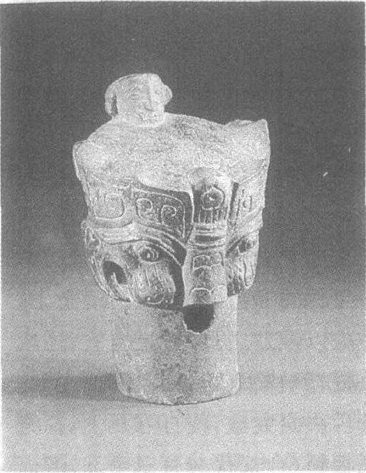 西周。高12.8厘米,径5.1厘米。1974年至1975年陕西省宝鸡茹家庄出土。宝鸡市博物馆藏。此车饰中空,下端有口,前后有相对穿孔。上端为一饕餮,巨鼻咧嘴,须孔清晰,后有披发人呈爬伏状,人发梢尖而下垂,下身着短裤,腰系方格纹宽带,上身裸露,肩上有相背鹿纹。其造型特殊,设计精巧,人形从发式看,应属当时少数民族。