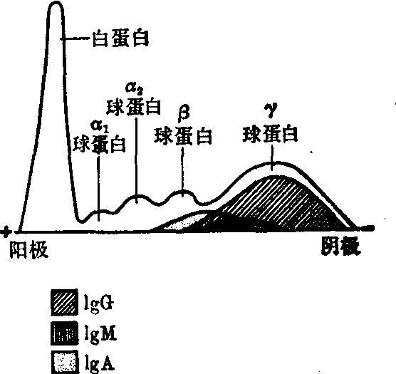 图1 免疫球蛋白的电泳分布 IgG在电泳中分布于从α2到γ2的很长一段范围内。它由两对肽链构成: 一对较长,各有420~440个氨基酸残基,称为重链(H);一对较短,各有212~214个氨基酸残基,称为轻链(L)。四条链由共价键和非共价键 (二硫键)连在一起,构成一个分子量约160,000的球蛋白 (图2)。肽链由基本单位组成,各基本单位有不同的功能,故又称“功能区”。重链有4个功能区,从N端起依次称为
