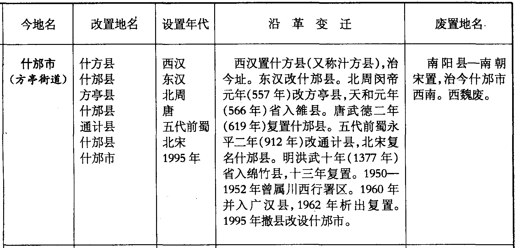 什邡市(方亭街道)什方县什邡县方亭县什邡县通计县什邡县什邡市西汉东汉北周唐五代前蜀北宋1995年西汉置什方县(又称汁方县),治今址。东汉改什邡县。北周闵帝元年(557年)改方亭县,天和元年(566年)省入雒县。唐武德二年(619年)复置什邡县。五代前蜀永平二年(912年)改通计县,北宋复名什邡县。明洪武十年(1377年)省入绵竹县,十三年复置。1950—1952年曾属川西行署区。1960年并入广汉县,1962年析出复置。1995年撤县改设什邡市。南阳县—南朝宋置,治今什邡市西南。西魏废。